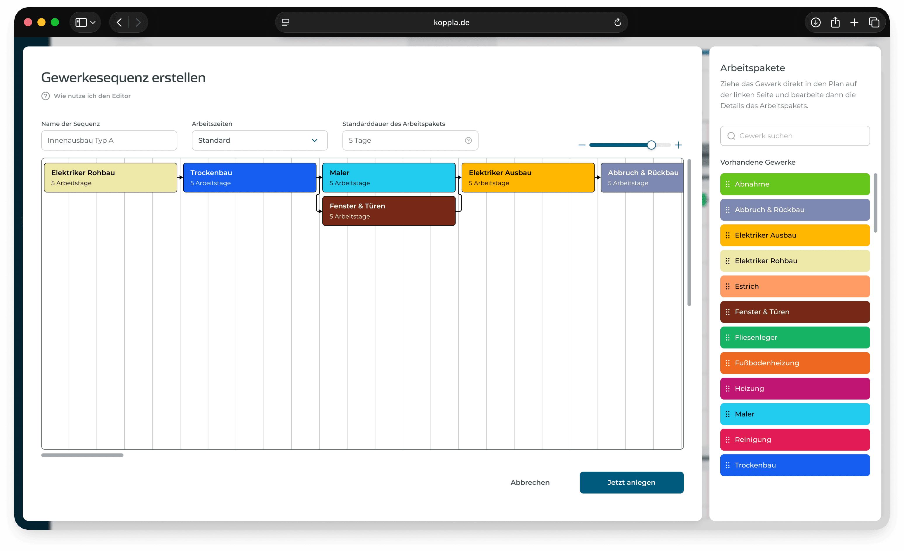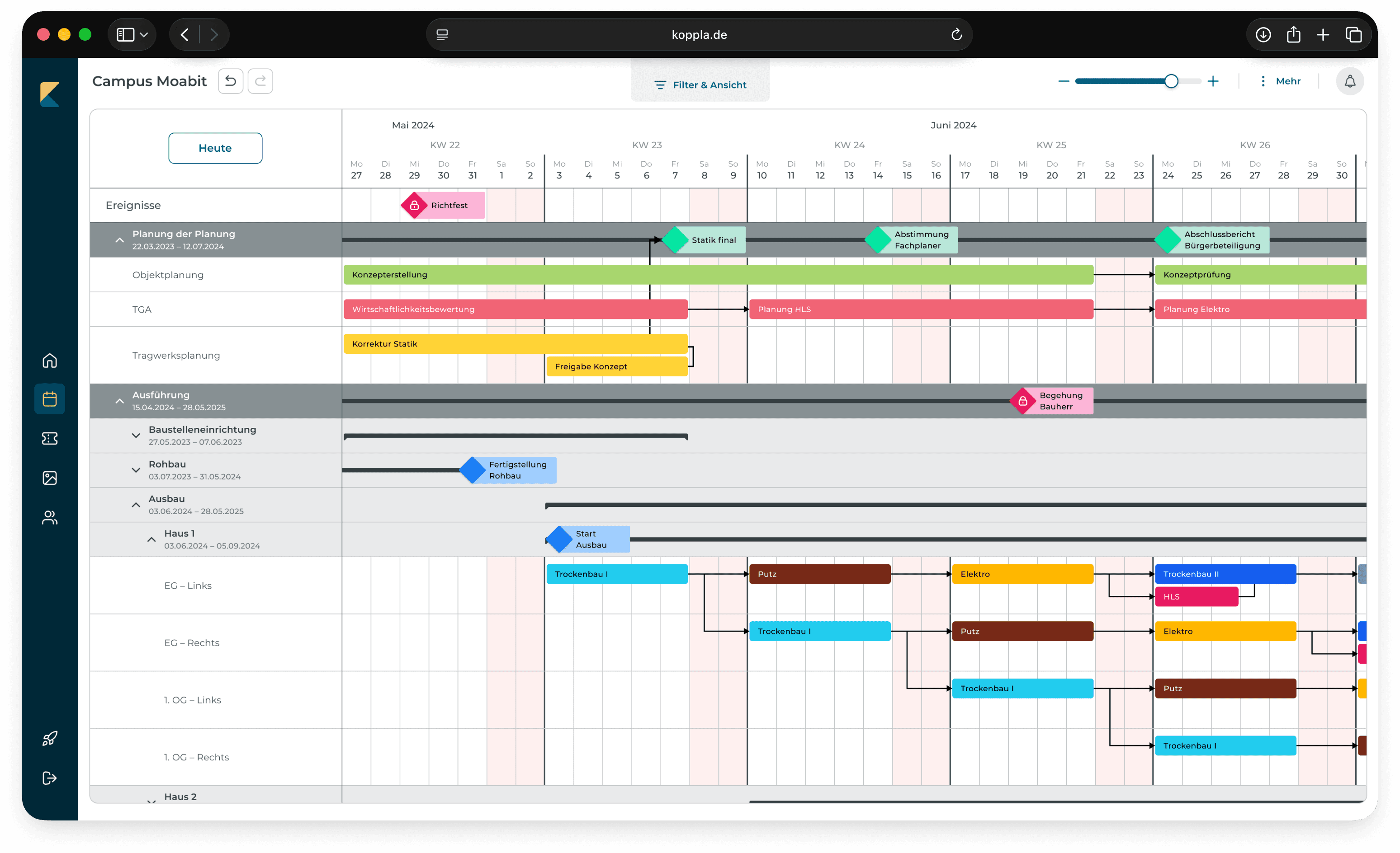 Starre Terminpläne funktionieren nicht im dynamischen Baualltag. koppla ist der erste Terminplan, mit dem Du Verzögerungen und Fortschritte in Echtzeit erfasst und mit allen teilst – für schnellere Terminplanung, kürzere Projektlaufzeiten und weniger Kosten.