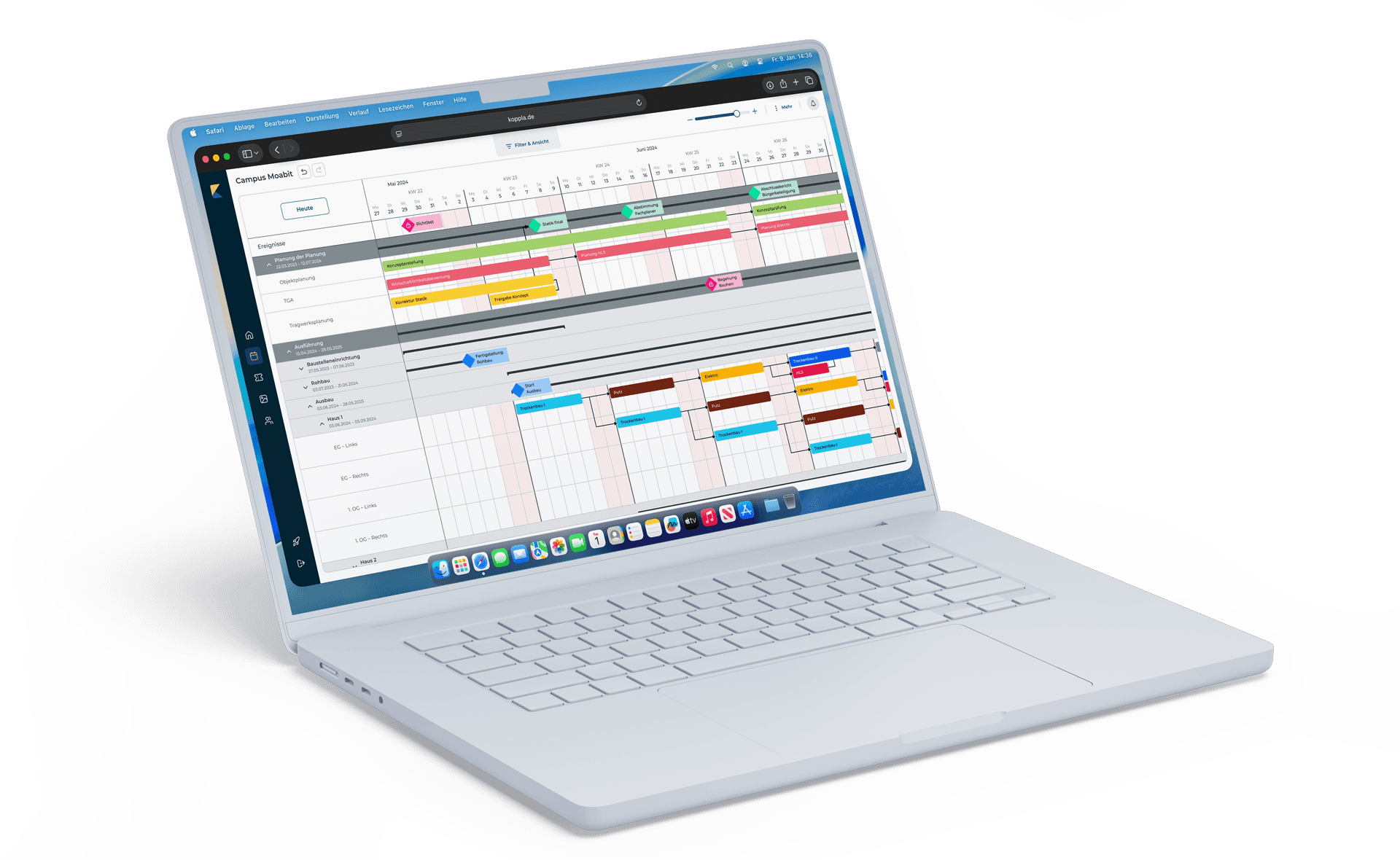 koppla ist eine webbasierte SaaS Plattform zur strukturierten Terminplanung und Steuerung komplexer Bauprojekte. Sie verbindet Planung und Ausführung in einem gemeinsamen System und schafft Transparenz über Abhängigkeiten, Verantwortlichkeiten und Fortschritt.