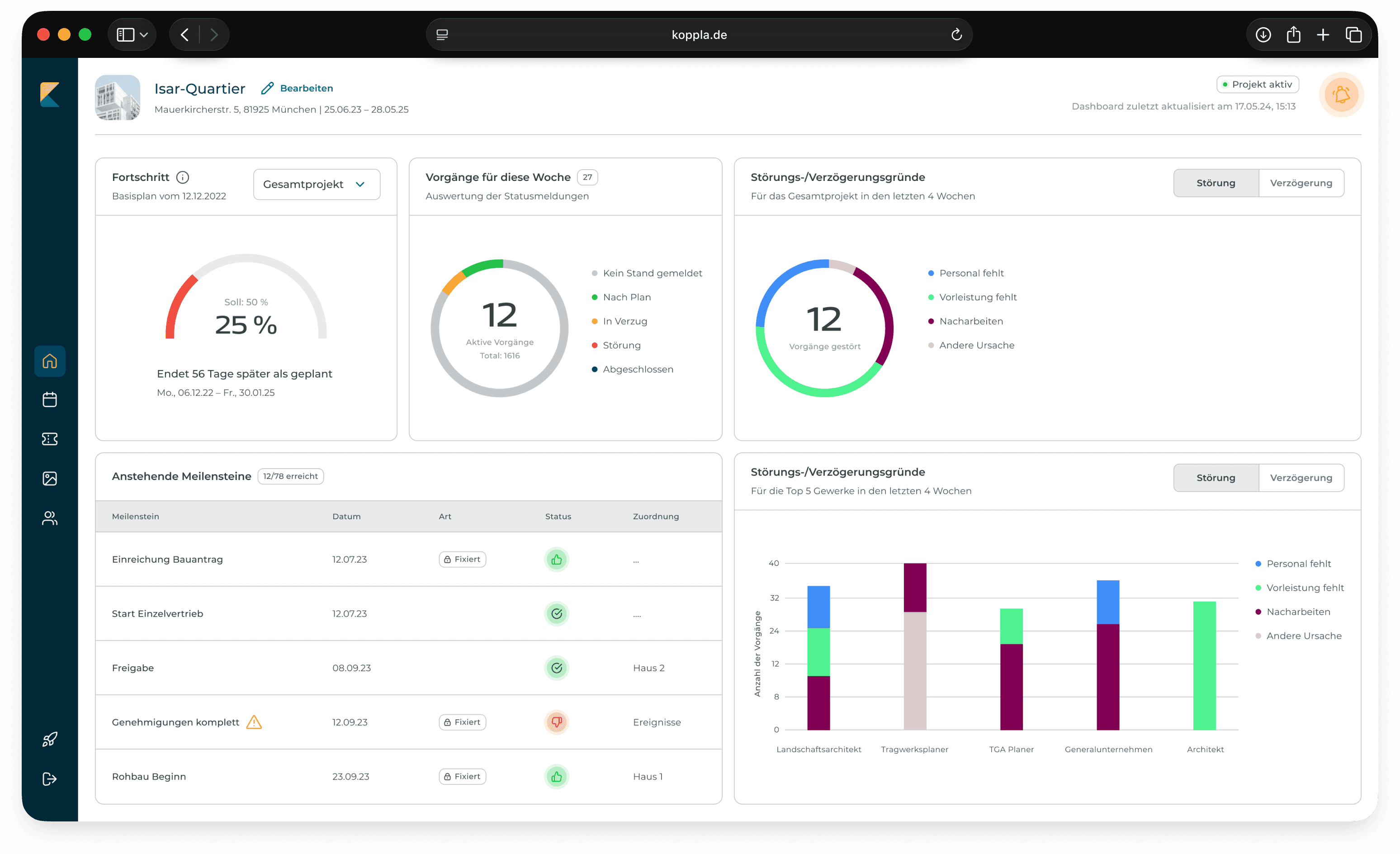 Craftdrive startete mit der Vision, als firmenübergreifende Kommunikationsplattform Handwerk und Baustelle zu vernetzen. Auftragsvergabe, Nachverfolgung und Dokumentenaustausch sollten in Echtzeit möglich werden -> intuitiv nutzbar, auch ohne digitale Erfahrungen. Ende 2020 entstand daraus koppla, ein Lean Betriebssystem für Großbaustellen, das General- und Nachunternehmen eine gemeinsame Plattform bietet. In den folgenden Jahren entwickelte sich das Produkt konsequent weiter: aus einer Lösung für die Bauausführung wurde ein ganzheitlicher Terminplan, der alle Phasen von Bauprojekten abbildet.